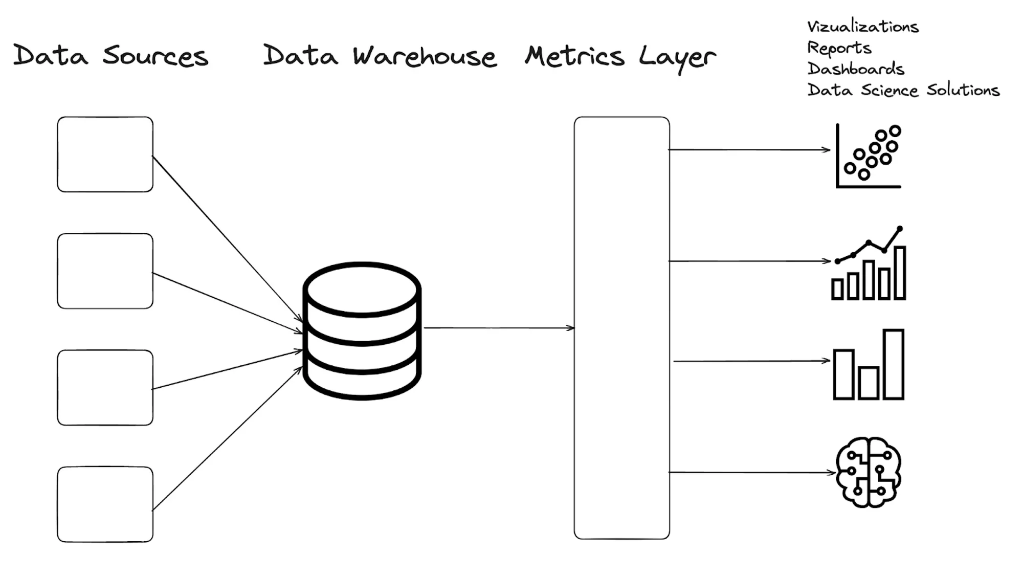 A metrics layer acts as a central translation layer between your technical data models and anyone who wants to interact with your data. It allows your team to provide consistent definitions for key business metrics across all your reporting and analytics so that shared KPIs are always calculated in a consistent way no matter who’s doing it.